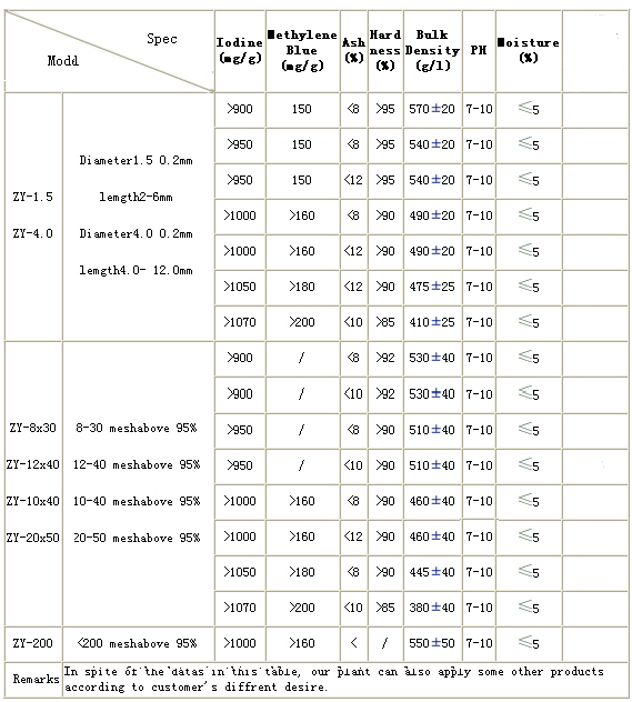 The product uses high quality coal as raw material. It is carefully made by advanced technological equipments. It looks like some columnar dull-black granules or adventitious granular. It is a kind of activated charcoal with many characteristics. It has big specific surface area, suitable hole structure and high mechanical strength. It can withstand high temperatures and high pressures. It can not easily be tattered. It can be easily regenerated. It has a long using lifetime, and is widely used in purification, decolourant, dechlorination, desmelling, deoilation of industry using water and waste water treatment, super pure watermaking in electronics and pharmacy, water-purification in food industry and removing organic matter and colored molecule.