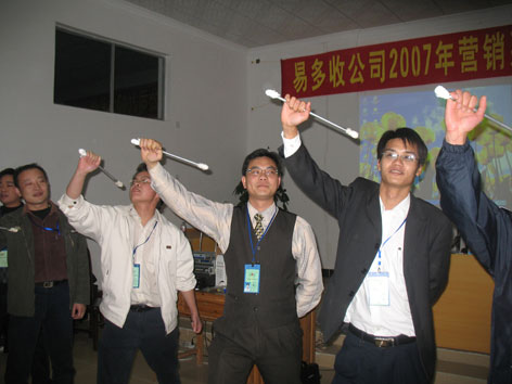 07年1月27日易多收公司2007年营销系统第一期培训班在我公司南宁化工厂会议厅开班。参加本次培训班的有我公司销售战线上的销售人员。由深圳逸马管理顾问有限公司首席团队训练师对我公司销售人员进行销售技巧及团队协同训练。经过训练师对我公司销售人员指导训练,既提高了销售人员的销售能力,也加深了公司员工之间团队的协同合作。