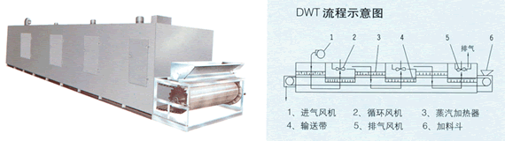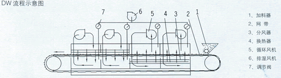 工作原理如下图所示,料斗中的物料由加料器均匀地铺在网带上,网采用12-60目不锈钢丝网,由传动装置拖动在干燥机内移动。干燥段由若干单元热风独立循环其中部分尾气。在上循环单元中,循环风机5出来的风由侧面风道进入下膛,气流向上通过换热器4加热,并经分配器3分配后,成喷射流吹向网带,穿过物料后进入上腔。干燥过程是热风气流穿国物料层,完成热量与质量传递的过程。上腔由风管与风机入口相连,一部分气体循环,一部分温度较低含湿量较高的气体作为废气经排湿管、调节阀、排湿风机排出。下循环单元中,循环风机出来的风先进入上腔,向下经换热器,穿过物料层进入下腔,下腔由侧面风道及回风管与风机入口相连,大部分气体循环,一部分排出,上下循环单元根据用户需要可灵活配备,单元数量亦可根据需要选取。