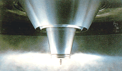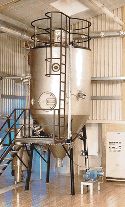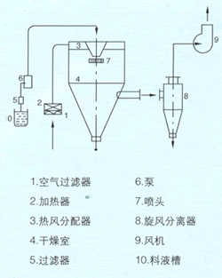 空气通过加热器转化为热空气进入装置在干燥室顶部的热风分配器然后均匀地进入干燥室内,并呈螺旋状转动,同时将料液送至装置在干燥室顶部的离心雾化器,将料液喷成极小的雾状液滴,使料液和热空气并流接触,水份迅速蒸发,在极短的时间内干燥为成品。成品连续地由干燥塔底部和旋风分离器中输出,废气由风机排空。 |