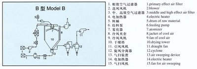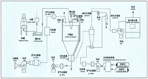 3 、干燥室内装有压缩空气冷却回转吹扫设备消除或减少粘壁现象。