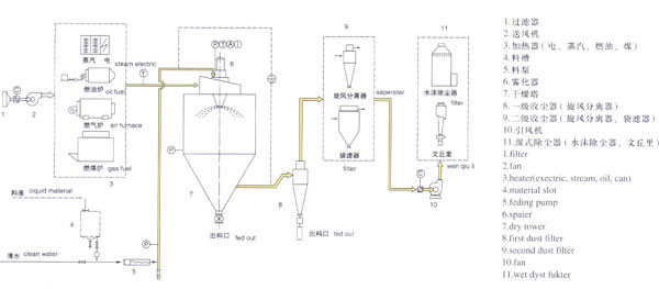 Air is turned into hot air through air filter and enters into hot air distributor at the top of dry chamber and then enters into dry chamber and rotates in the state of helix. At the same time liquid of raw material is sent to centrifugal atomizet at the top of dry chamber. Pumped by pump through filter. In which liquid of raw material atomizers small drops. Airand liquid of raw material flow and contact each other fully. The moisture vaporize rapidly. Liquid of raw materia is dried into finished product in a short time. The finished product is discharged through cyclone separator at the bottom of drier. The wasted air is exhausted through fan.