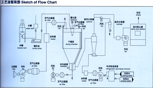 Principle: High speed centrifugal atomizing device is an application of centrifugal atomizing technology at special material to be dried. That is to say, it is a drying device by using high speed centrifugal atomizer to make material distribute fog and contact with hot air fully, and finish instantaneous dry and formpowder finished product.
