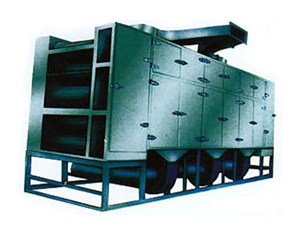 若干单元组成,热风在两个(或几个)单元内横向循环,新鲜空气由风机(1)进入,通过换热器(3)加热,热空气穿过物料层与物