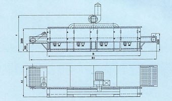 原理如图所示,料斗中的物料由加料器(6)均匀的铺在不锈钢丝网(4)上,由传动电机带动网带在干燥箱内匀速移动。干燥段由