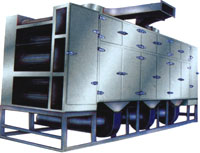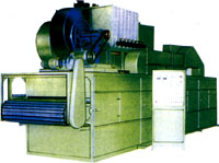 the driver by a transmission device.The drier is composed of several units.For each unit,the hot air is circulated separately.In the first unit,air out from circutation air blower (5)pass through beside into low uunit,after air is up and heated by steam heater(4),be shared by seperater(3),theair is spraied through mesh-belt in to top of machine.The drying process is hol air passes through the mesh-belt covered with a special moisture from thetop to the bottom of from the bottom to the top,and this will complete the heat and mass transfer process.The air pipe of the top is conected with fan,one part of air is circulated,some exhausted gas is discharged with a special moisture eilmination blower and other waste gas is controlled through an adjutment eilmination blower,and other waste gas is controlled through an adjustment valve.The top and low circulation units can be freely equipped according to the usersi demand.The unit nomber can he selected according to the demand.