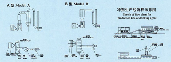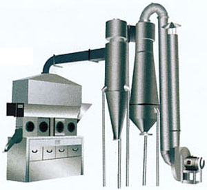 沸腾干燥机 又称流化床,它是由空气过滤器、沸腾床主机、旋风分离器、布袋除尘器、高压离心通风机、操作台组成。由于干燥物料的性质不同,配套除尘设备时,可按需要而进行,可同时选择旋风分离器、布袋除尘器,也可选择其中的一种。一般来说,比重较大的物料只需选择旋风分离器;比重较轻的物料需配套布袋除尘器,并备有气力送料装置供选择。