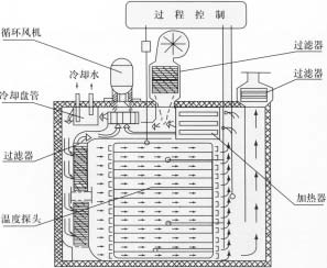 经过加热的干空气,在热风机的作用下产生微压,通过耐高温高效过滤器进入箱体,在缓冲微调板作用下形成一个均匀的分布空气向箱体内传递,热干空气吸收瓶子表面的水分,进入加热通道蒸发排出,干空气在热风机作用下,定向循环流动。