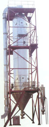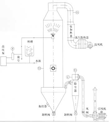干燥介质经过滤后进入加热器,经热风分配器后进入干燥室。料液由压力泵输送至雾化器,经雾化后的雾滴表面积增大,与干燥室中的热空气接触,水份迅速蒸发,干燥成为颗料产品,由除尘器搜集,废气由引风机排出。
