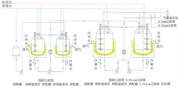 | 本公司生产的PG系列浓配罐、稀配罐,设计合理、工艺先进、自动控制,完全符合国家GMP认证要求。罐体均采用立体式双层结构,内胆抛光Ra0.45,外部采用镜面板或磨砂板保温,整体美观。夹套内可通蒸汽或冷却水,满足工艺要求,夹套外填充保温材料。内罐体上下全部采用椭圆封头,整体光滑无死角,搅拌采用立式偏心轴流搅拌,罐项装设入孔、进料口、回流口、消毒口、清洗球,并装设(0.45μm)空气呼吸器,底部装有进料口、液位传感器探头、侧面装设温度计口。备有控制柜操作,检测药液温度并显示、恒温控制、检测液位高度并显示、提供上下限报警等功能。