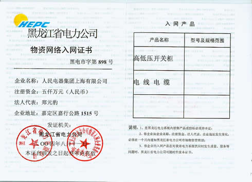 高低压开关柜、电线电缆黑龙江省物资网络入网证书