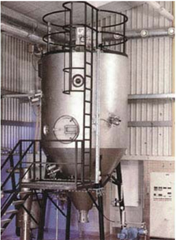 空气通过加热器转化为热空气进入装置在干燥室顶部的热风分配器,然后均匀地进入干燥室内,并呈螺旋形转动,同时将料液送至干燥室顶部的离心雾化器,将料液喷成极小的雾状液滴,料液和热空气并流接触、水份迅速蒸发,在极短的时间内干燥为粉状。操作简单,调节控制方便,容易实现自动化作业。