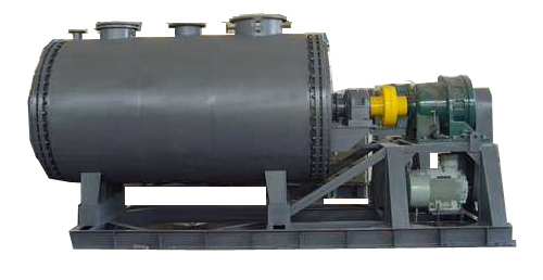 被干物料从机体上方进料口加入,在不断正反转动耙齿的搅拌下,物料轴向来回转动,与壳体内壁接触的表面不断更新,受到蒸汽的间接加热,耙齿的均匀搅拌,粉碎棒的粉碎,使物料内部水份快速汽化,在真空系统的作用下,汽化的水份经除尘器、冷凝器、从真空泵出口放空。