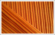 灯芯绒组织采用两组纬纱与一组经纱交织的纬二重组织,地组织有平纹、斜纹等。灯芯绒由一组经纱和二组纬纱织成,其中一组纬纱(称地纬)与经纱交织成固结绒毛的地布,另一组纬纱(称绒纬)与经纱交织构成有规律的浮纬,割断后形成绒毛。地纬与经纱交织构成地布,绒纬与经纱交织形成一列列毛圈,通过割绒将毛圈割断,经刷绒整理后,织物表面就形成了耸立的灯芯绒绒条。 锦涤灯芯绒是由超细纤维经机织.割绒.开纤.染色而成,灯芯绒绒条圆润丰满,绒毛耐磨,质地厚实,手感柔软,保暖性好。主要用途:男、女、老、幼服装,鞋帽,也宜做家具装饰布、手工艺品、玩具、服装内里布、时装面料,高档浴袍绒,玩具绒面料,鞋面料以及室内家居装璜布料,被套绒布,沙发布、靠垫,靠枕面料,汽车布,床上用品布,毛毯绒布等。灯芯绒面料的洗涤:灯芯绒洗涤时不宜用力搓洗,也不宜用硬毛刷用力刷洗,宜用软毛刷顺绒毛方向轻轻刷洗,不宜熨烫,收藏时也不宜重压,以保持绒毛丰满、耸立。印花灯芯绒一般先印花后刷绒,故图案设计必须考虑其刷绒后的效果,纹样不宜纤细。 我公司是生产型企业。主要使用韩国原料(海岛纤维、涤锦复合纤维),专业生产高档双面绒、灯芯绒,仿平绒,超细纤维无尘布系列。