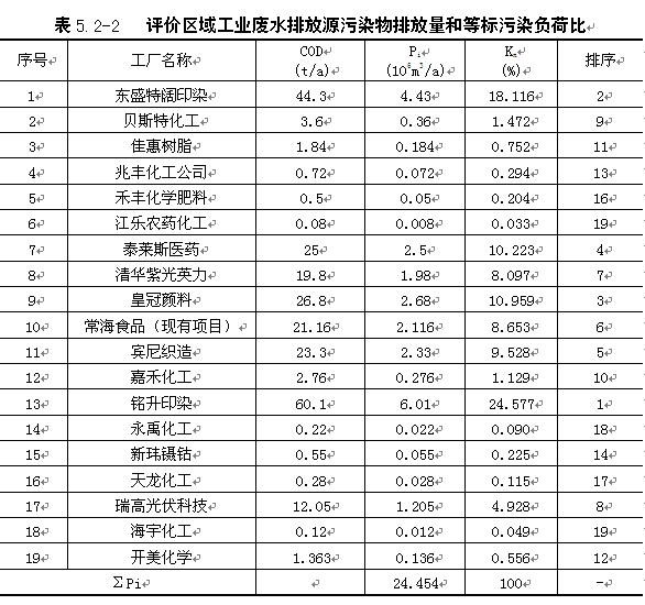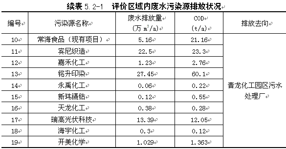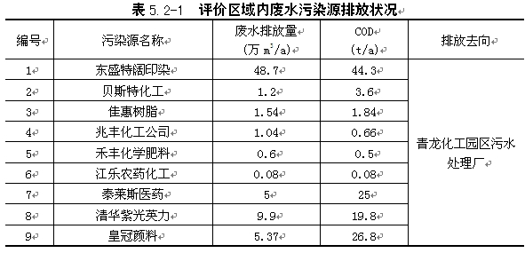 | 本次区域污染源调查,均以各企业环评批复或验收的污染物排放量为准,进行统计。根据调查,评价区内19家主要废水污染源的的排放情况具体见表5.2-1。 |
