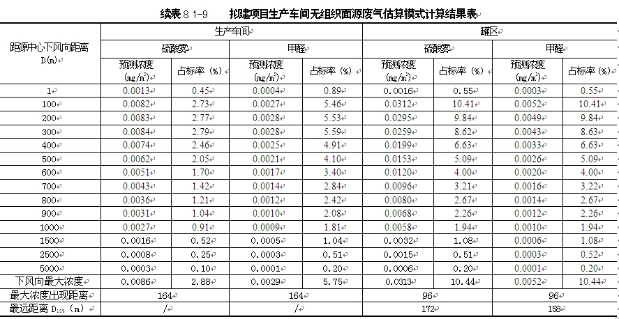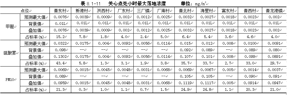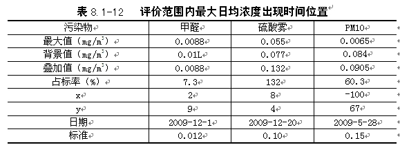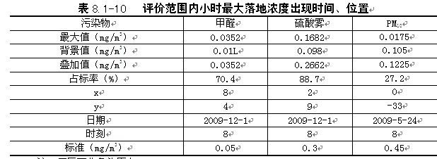 | 利用20091年气象资料,逐日逐次预测拟建项目排放的污染物甲醛、硫酸雾、颗粒物在评价范围内小时最大落地浓度,并叠加背景值(以现状监测值的平均值代替),同时给出最大落地浓度出现时间、位置,具体结果见表8.1-10。 |
