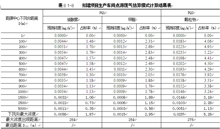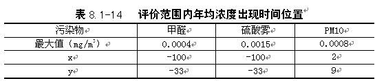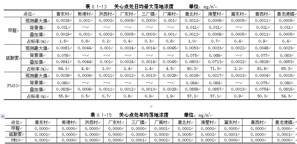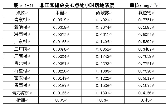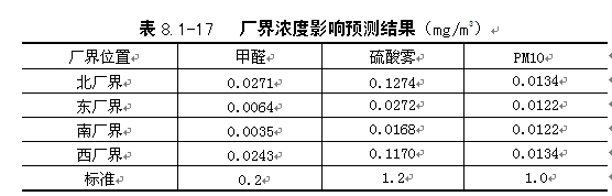| 由表8.1-12可知,甲醛、PM10污染物日均最大落地浓度叠加背景值后均满足相应空气质量标准,硫酸雾的影响值叠加叠加背景监测最大值后占标率达到132%以上,最大落地浓度点位于厂区范围内,厂界浓度符合标准。 |