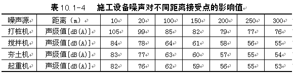 | 如按施工机械噪声最高的打桩机和混凝土搅拌机计算,作业噪声随距离衰减后,有同距离接受的声级值如表10.1-4。 |