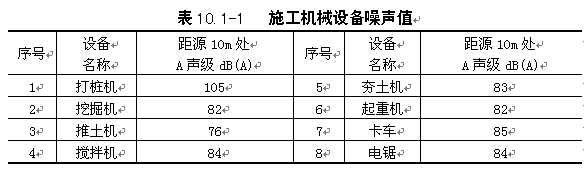 | 施工期间,运输车辆和各种施工机械如打桩机、挖掘机、推土机、搅拌机都是主要的噪声源,根据有关资料,这些机械、设备运行时的噪声值如表10.1-1。 |