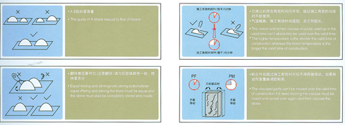 使用方法 1、粘接面必须清洁干净、无浆皮、松散物尘埃、油和油脂。 2、将A与B按1:1混合搅拌均匀呈色泽一致。 3、用钢制刮刀或类似的工具均匀涂于粘接面。