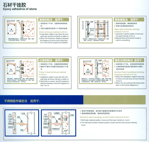1、主要用于石材内外墙干挂粘接。 2、混凝土预制件及结构件外围加固粘结。 3、用于瓷砖、大理石拼花粘结。 4、瓷砖/砖块、瓷砖/混凝土接着剂及勾缝剂。 5、混凝土裂缝修补 6、植筋、种铁用的锚固材料。